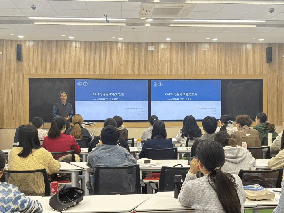 随后,王强围绕CATTI考试的基本情况、题型结构、评分标准及近年真题主题等内容进行系统讲解。他结合自身丰富的教学与评审经验,深入剖析考生在翻译实践中常见的误区与难点,并提出切实可行的备考策略。王老师建议同学们科学制定复习计划,注重基础知识巩固与翻译技巧训练,加强模拟练习与真题实战。在互动环节,王老师通过现场翻译演练与即时点评,帮助学生在真实语境中深化理解、优化方法,现场气氛热烈,学生反响积极。