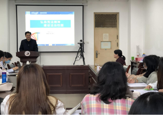 庞亚宾以研究生违法案例和时事新闻为导入,给研究生们剖析了违法案件的教训和警示意义,围绕宪法内容、精神及意义进行了重点解读。随后,通过观看视频,他向研究生们科普了常见的网络骗术以及防骗技巧,提升了同学们法制知识储备;同时提醒同学们注重心理健康,增强法制知识,远离违法犯罪。