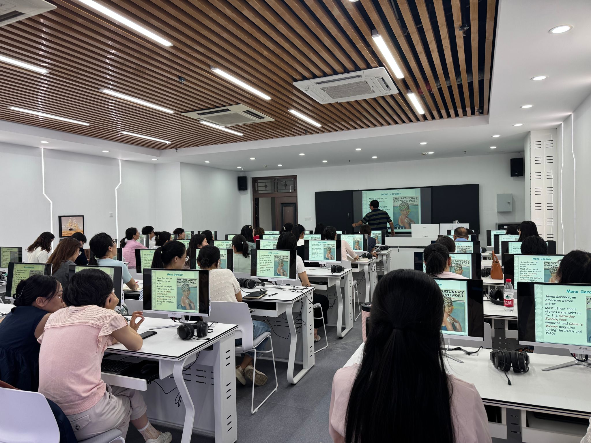 在教学楼第十三语音室开展了智慧语言教学培训。本次培训特邀请相关技术专家现场进行教学指导,全体教师参加了此次培训。