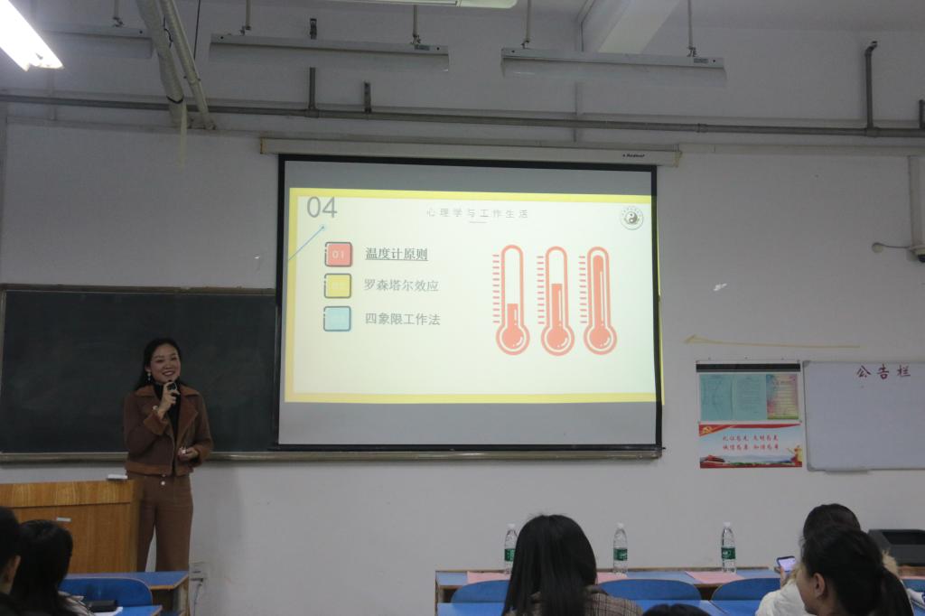 活动伊始,苏书记联系自身经历,着重强调了心理健康的重要性,他希望各班心理委员能够提高自身心理素质和工作能力,不断增进班级凝聚力。接着,由乔丹妮进行经验分享与交流,她首先以一段精彩的视频与我们分享她的百佳心委历程。然后通过与在场同学互动的方式,指出优秀学生干部所应具备的特质,细心的乔丹妮学姐还为在场的学弟学妹们准备了小礼品,让活动现场更加温暖。