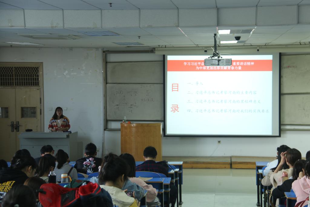 2019年9月16日至18日,在河南省委书记王国生、省长陈润儿陪同下,习近平总书记先后来到信阳、郑州等地,深入革命老区、农村等区域,围绕经济社会发展和“不忘初心、牢记使命”主题教育情况进行考察调研。主讲人陈改革以这一事件为主题,以习近平总书记的河南情为线索,围绕"习近平总书记考察河南的主要内容、里程碑意义、对我们的实践要求"三个方面展开讲述。最后,陈改革引用十九大习近平总书记“青年兴则国家兴,青年强则国家强,青年一代有理想、有本领、有担当,国家就有前途,民族就有希望"的重要讲话,为本次宣讲活动画上一个圆满的句号。