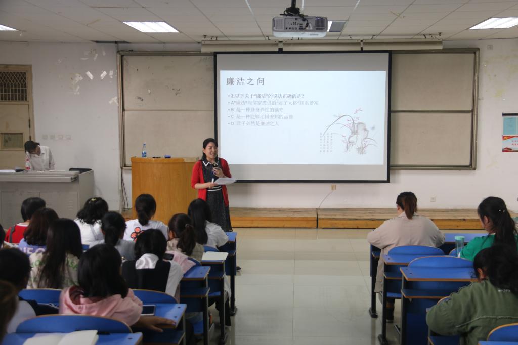 讲座中,朱院长结合调查问卷数据,以趣味独特的方式向同学们讲述廉洁的传统文化知识,重点阐述了廉洁教育的主要内容以及在大学生中开展廉洁教育的重要性,希望同学们时刻谨记廉以修身,洁以养德。接着,"杏林学廉"社团负责人李笑娜为同学们介绍了社团的成立历史、宗旨,展示了社团成立以来举办的丰富多彩的活动,强调了社团作为载体在廉洁教育中发挥的重要作用。讲座最后,社团成员代表分别进行了《爱"廉"说》脱口秀和诗朗诵《幽幽"廉"香,轻轻"洁"行》的精彩表演,让同学们在轻松的氛围中感受着廉语廉风。