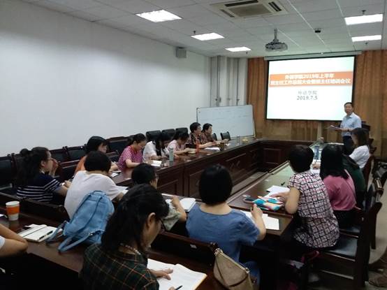 于2019年7月5日下午4点在A638会议室举办了上半年班主任工作总结会议和新聘班主任培训会议。学院学生主管领导苏峰副书记、辅导员陈少峰老师和全体班主任老师参加了会议。