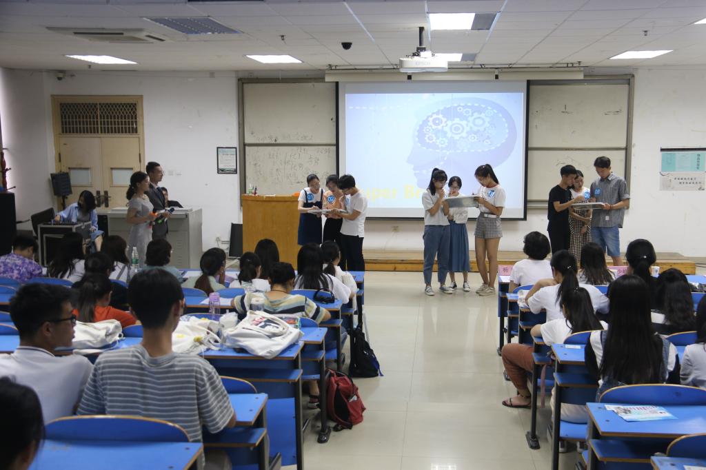 在热烈的掌声中,决赛拉开了帷幕。比赛分为小组赛和个人赛两个部分。小组赛包括“单词速记”和“线索猜词”两个环节,不仅考察了选手们的单词记忆能力和赛场的心理素质,更充分体现了选手间的团队合作精神。个人赛包括“慧眼识词”和“Spelling bee”两个环节,考验了选手们的应变能力和反应速度,在“Spelling bee”环节中,裁判读出单词的读音,选手们口头拼写,师生间的互动将赛场的气氛推向高潮。在中场休息环节,主持人邀请现场的观众上台进行游戏互动,让更多的同学领会到单词拼写的乐趣。最后,杨晓老师、买宁老师为比赛中成绩优异的选手颁发荣誉证书,在欢声笑语中比赛圆满结束。