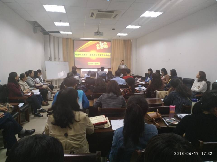 于2017年4月17日下午在A638举行了第十一届教学大奖赛。比赛评委由学校督导团梁华龙教授、王庆宪教授、学院教学督导团成员等8位专家及学生代表组成。比赛由英语语言文学学科主任王玖炜老师主持。