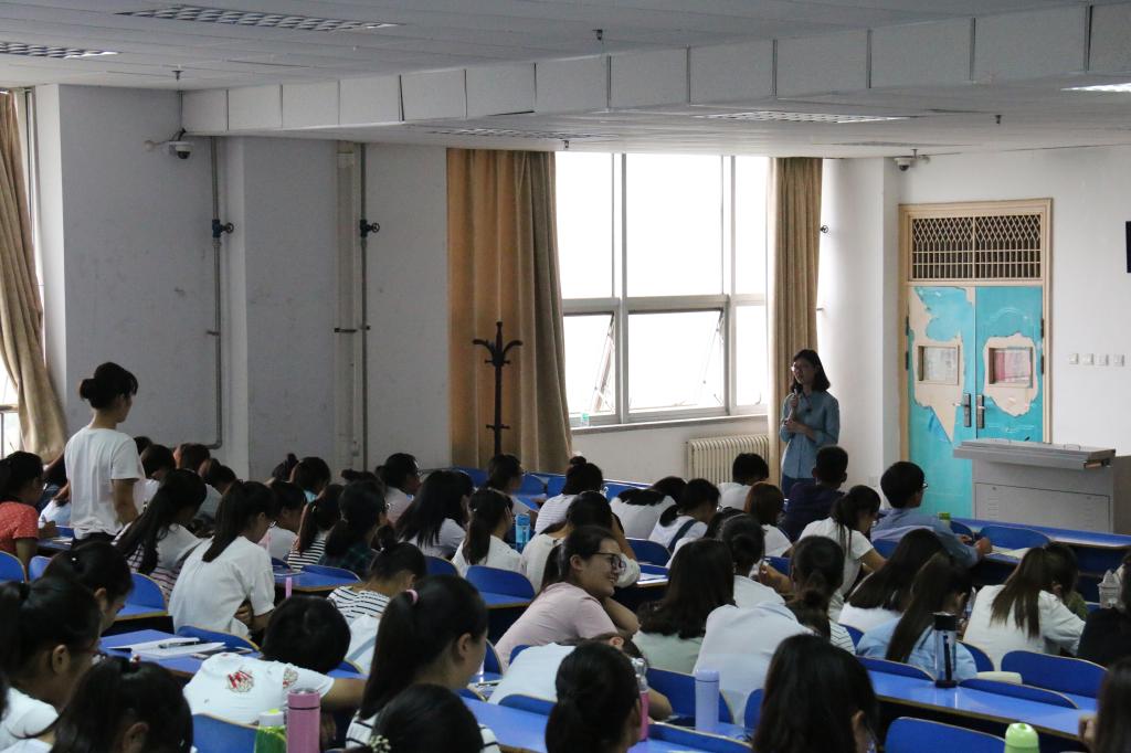 在教学楼四楼阶梯教室组织我院新生观看大学生礼仪视频。