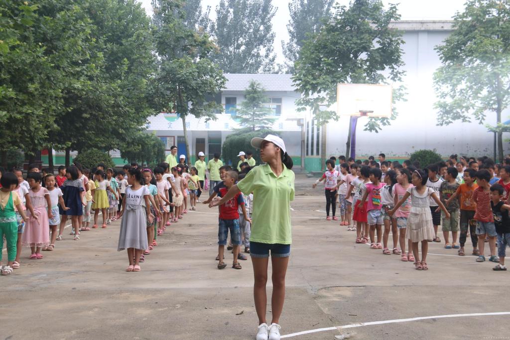 留守儿童的暑期教育是此次活动的重心。与日常教学不同,课程涵盖了体育、感恩、安全、品德、舞蹈等。内容丰富、形式新颖的教学得到了孩子们的喜爱,课堂气氛十分活跃。孩子们在体育课中学习八段锦、五行掌等传统保健气功,感恩课中学习手语向家人表达爱意,安全课中学习食品安全和预防水患、触电、交通事故等,品德课上增强主人翁意识、爱党爱国情怀,舞蹈课中跳出的《鸭梨山大》,让人忍俊不禁。良好的教学效果得到了学校老师的认可,大王庄小学校长刘青梅对此次活动给出了很高评价:教学形式新颖,效果明显,是日常教学活动的补充,帮助学生度过了充实、有意义的假期。此外,为了丰富孩子们的课余学习生活,小分队还向学校捐赠了100本儿童读物和若干文体用品。