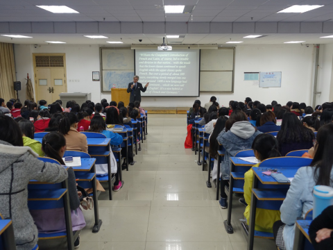 英语语言文学学科主任王玖炜主持,全校二百多名师生到场聆听了讲座。