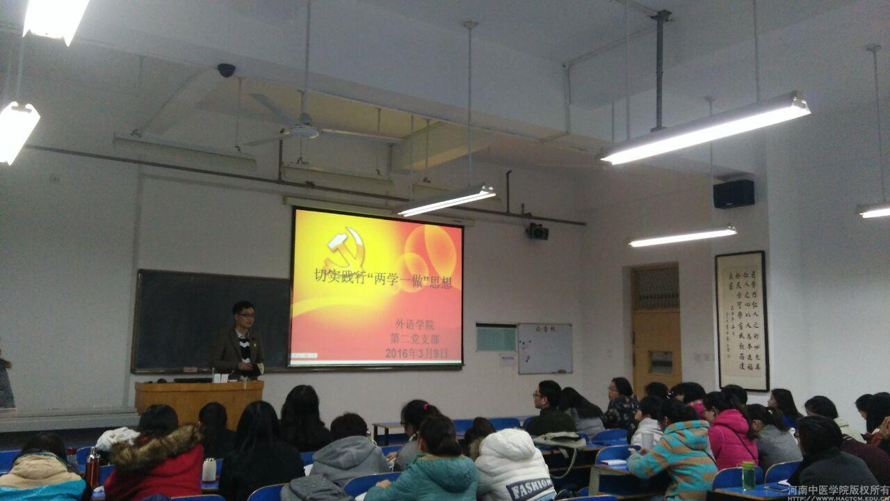 学生党总支第二党支部,在教学楼A424教室率先开展“两学一做”专题学习教育活动。为进一步学习党章党规、系列讲话精神、合格党员的标准,二支部采用优秀党员讲解、全体党员参与的方式,选取党章党规的内容进行讲解和温习。随后,支部组织党员观看“两学一做”视频,让大家对“两学一做”有了更加深入的了解。视频播放结束后,参会者踊跃发言,谈自己心得和体会:一、坚定理想信念,把理想信念体现在行动上。二、做一名有信念、讲规矩、有纪律,讲道德、有品行,讲奉献、有作为的合格党员。最后党支部书记希望大家把“两学一做”的具体内容贯彻到自己的学习和生活中,不断提升自己,做一名优秀的共产党员,为实现中国梦不断奋斗!