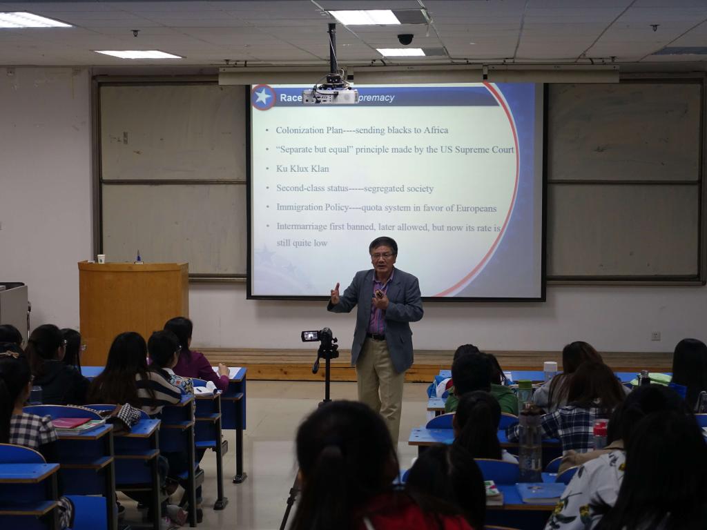 王教授以其渊博的学识、流畅清晰的英语以及诙谐幽默的讲授风格,分别从阶级、种族和性别三个方面阐述和剖析了美国人的平等和自由的理念,分析了美国社会的独特建构特征,揭示了美国在种族、阶级等方面诸多歧视与不平等现象的深层原因,以自己独到的视角和丰富的案例阐释了美国文化的价值内涵。