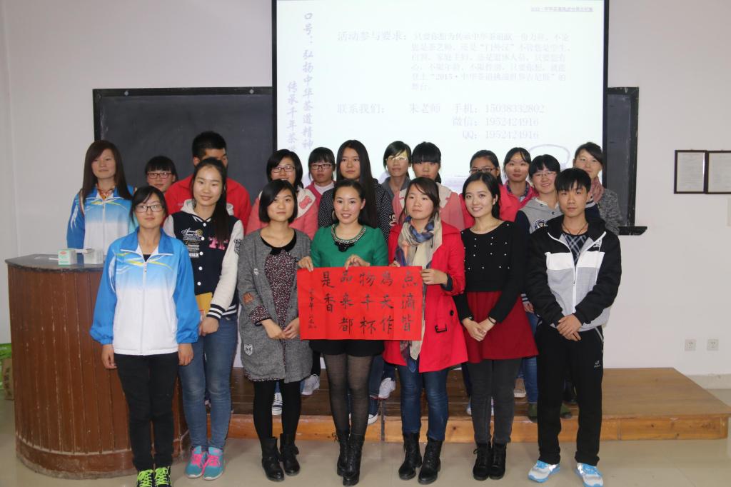 讲座伊始,汉风SHOW社团外联部部长、12级对外汉语专业学生刘婧为大家进行了茶艺表演,教大家识茶、泡茶、品茶等。接着,高级茶艺师冯艳丽老师为大家详细介绍了中国十大名茶,讲解它们的起源、产地、发展历史、所属茶系、茶用功效及茶艺表演艺术,同时还讲述了她学习茶艺并成为高级茶艺师的经历,冯老师精彩的讲说引起同学们极大的兴趣,与同学们的互动环节冯老师特意准备了精美礼品------铁观音。最后,冯老师还为大家提供了一个学习实践的平台,爱好茶艺的同学可以到天香茶艺培训学校免费学习茶艺,优秀者有机会参加2015年茶艺吉尼斯大赛。活动尾声,汉风SHOW社团向冯老师赠送了由社团成员书写的书法,表达感谢,并合影留念。