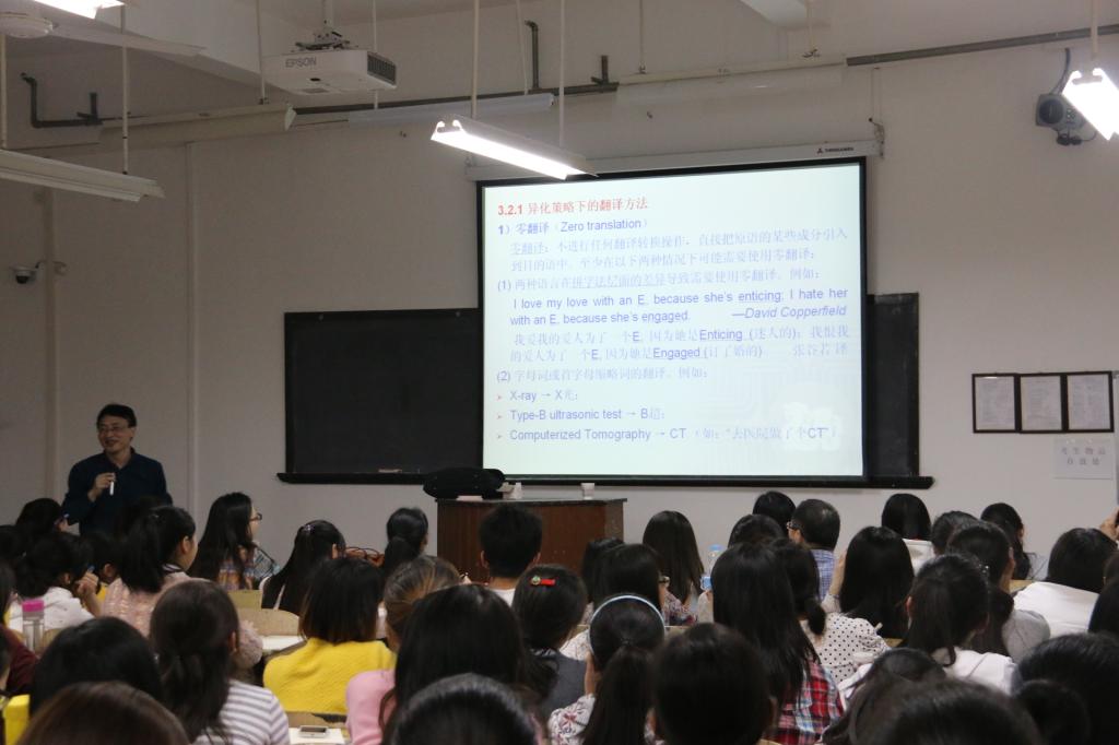 党委书记杨英豪、副书记苏峰、以及多位英语专业教师和众多学生参加了此次讲座。本次讲座由杨英豪书记做主持,他用简洁、风趣的语言向各位师生引荐了国内著名英语翻译专家、博士生导师熊兵教授。