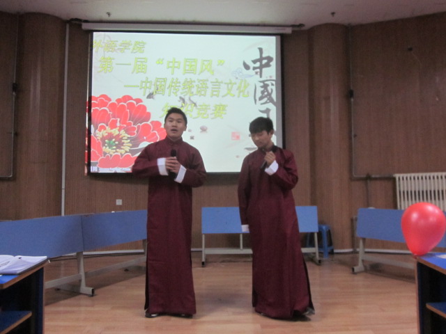 汉语国际教育专业全体学生参赛,旨在弘扬中华优秀传统文化,加强汉语专业学生的专业归属感和凝聚力,提高学生学习中国语言与文化的积极性。此次活动的初赛于12月11日晚举行,通过笔试的形式遴选出成绩位于前20名的选手参加决赛。此次决赛分为四个环节:第一环节为“先声夺人”,由选手进行自我介绍和才艺展示,并需体现出传统文化主题;第二环节为“步步惊心”,现场给出5道中国传统语言文化相关题目,由选手两人一组同时作答。第三环节为“狭路相逢”,由选手分两组进行抢答;最终环节为“华山论剑”,由经过前三个环节晋级的3名选手抽取中国传统文化相关主题,进行现场演讲。比赛中场穿插有精彩的二胡演奏、古词歌曲、相声等传统文化节目表演,使现场平添了不少轻松欢乐的气氛。各位参赛选手准备充分,发挥稳定,反应敏捷,以优秀的表现赢得了评委和观众的掌声与赞叹,体现出良好的文学素养和丰富的文化底蕴。