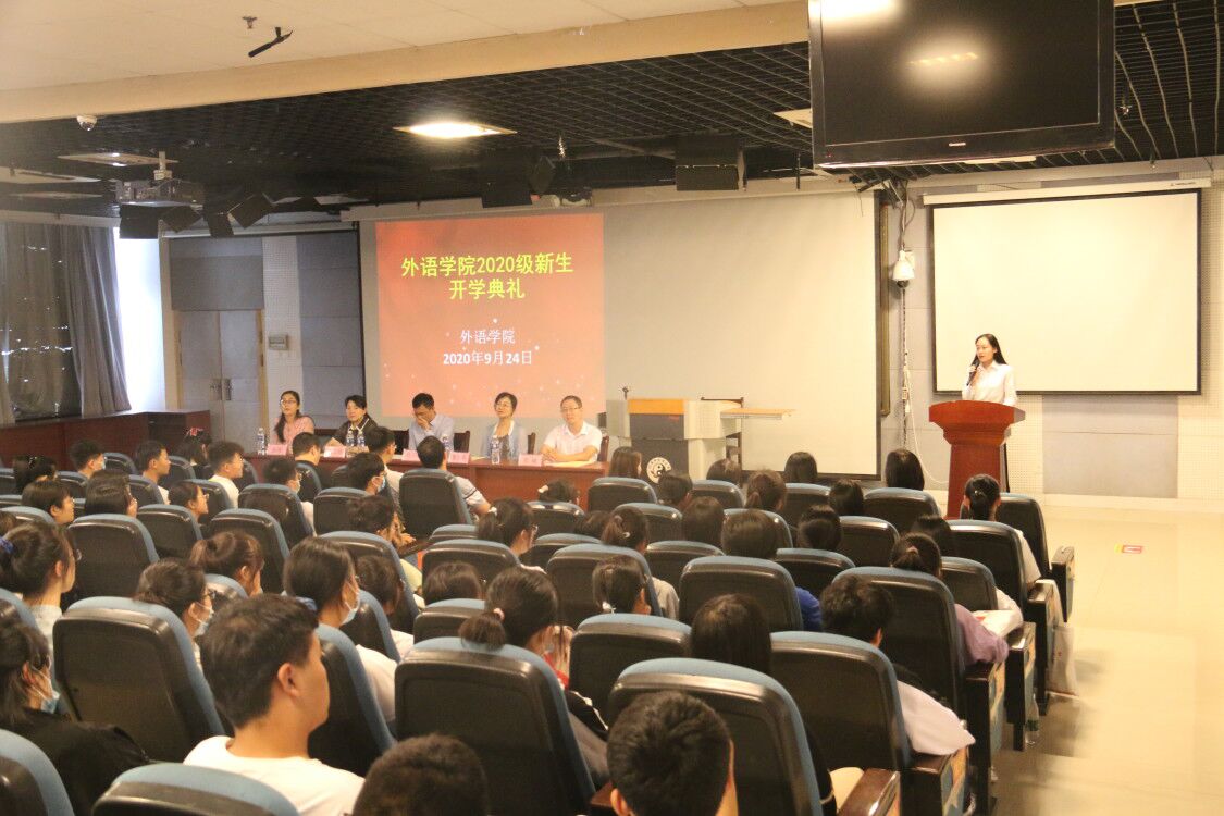 典礼伊始,全体师生起立,奏唱国歌。郭先英院长向2020级新生致欢迎词,介绍了我院办学历史、师资力量、教学设施及专业特色,让新生对我院有了更多的了解。杨晓老师作为教师代表发言,她希望2020级新生可以脚踏实地,一步一个脚印,努力掌握知识技能,丰富自己的大学生活。2017级汉语国际教育专业优秀学生代表乔丹妮同学积极与同学们交流大学阶段的学习经验,鼓励同学们要认真学好专业知识,积极参与实践活动,提高综合素质。2020级新生代表叶杨青同学在发言中也展示出了新同学的青春活力和昂扬斗志。最后,段其波书记总结讲话,他鼓励同学们要坚定理想目标,打牢专业基础,乐学善学,成为社会上有价值的人才。