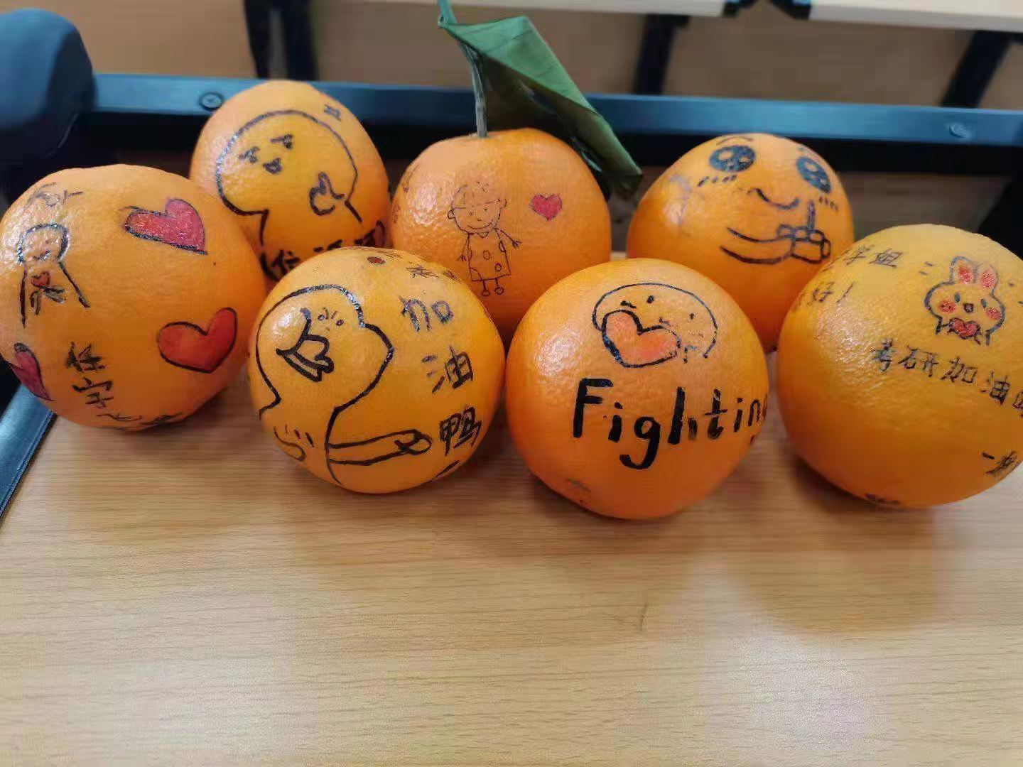 活动中,我院2018级全体同学认真地在橙子上面写下自己对即将考研的2017级学长学姐们的寄语和美好祝福,有“考研顺利,保重身体”、“加油!考研必上岸”和“保持热爱,奔赴理想”等,诚意满满,温暖多多。随后,2017级辅导员孙淑伟老师为所有毕业生分发暖心橙,送出我院专门为毕业生准备的温暖,祝愿我们的同学们可以在考试中马到“橙”功。毕业生们双手接过暖心橙,脸上写满了快乐和幸福。他们表示接下来一定会全力备考,不负师生期望。