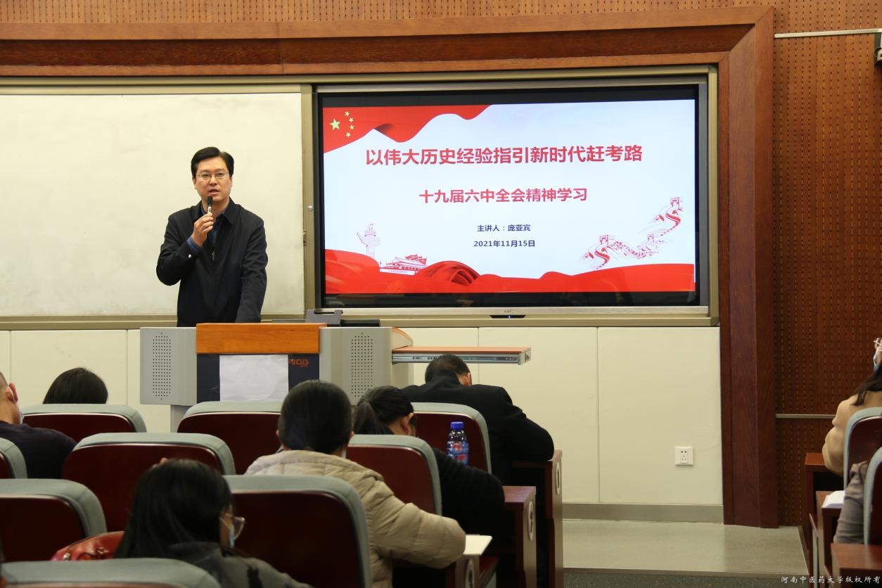 最后,庞亚宾强调,要把学习贯彻党的十九届六中全会精神作为党史学习教育的重要教材,与贯彻落实省第十一次党代会结合起来,迅速掀起学习宣传热潮,推动党员师生准确掌握会议精神,进一步增强“四个意识”、坚定“四个自信”、做到“两个维护”;以党的十九届六中全会、省第十一次党代表大会为契机,深入贯彻“立德树人”根本任务,坚持在大局下定位、思考、行动,细致谋划“十四五”发展,把会议精神转化为工作实效;锚定“两个确保”奋斗目标,创先争优,加压奋进,在学校“双一流”建设、学院发展进程中,在谱写新时代中原更加出彩的绚丽篇章中贡献更多河中医外语人的力量!