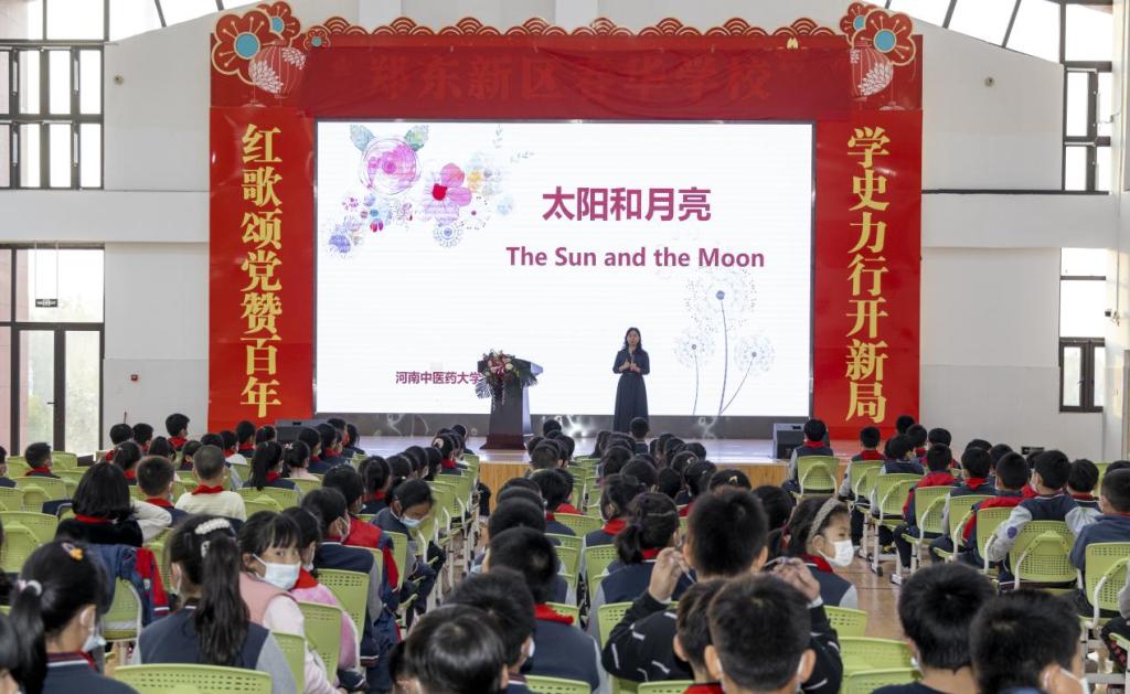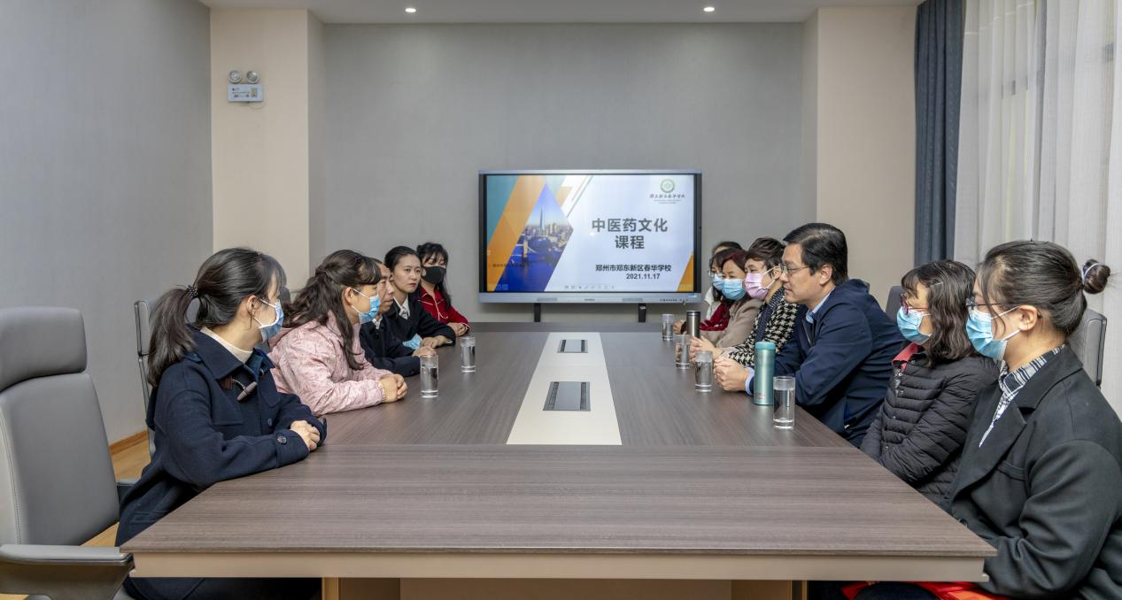 党委书记庞亚宾带领中医药文化宣讲团队走进郑东新区春华学校,开展“弘扬岐黄文化,感受神奇中医”中医药文化进校园系列活动。