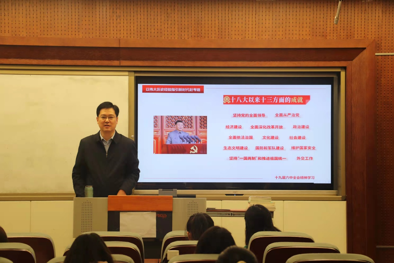 党委书记庞亚宾重点围绕“十个坚持”内容为同学们深入解读了党的十九届六中全会精神。他谈到,十九届六中全会以对历史的回望、对实践的思考、对规律的把握,引领全党、全国各族人民开启奋进全面建设社会主义现代化国家、实现中华民族伟大复兴的新征程。作为新时代青年,要心怀“国之大者”,把己志融入国志,着力在新时代的赶考路上贡献青年力量,为中华民族伟大复兴事业增添青春能量。第二阶段,师生围绕英语学习、专业发展、考研就业等同学们关切的问题开展了深入座谈交流。针对同学们提出的问题,英语教研室金雪老师、汉语国际教育教研室王晴阳老师进行了一一解答,并就专业学习、专业发展给同学们提出了一些切实可行,有指导意义的建议。关于大学阶段的学习成长,他们谈到,要尽量做到三个结合:第一课堂与第二课堂相结合、教师讲授与自身经验相结合、身体锻炼与精神涵养相结合。之后,3位2021级研究生给同学们分享了自己考研求学经历,鼓励同学们要相信自己。If you will,you can!