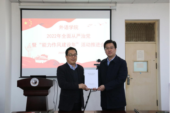全体科级干部、支部书记向庞亚宾分别递交全面从严治党责任书。外语书院全体教师将以全面从严治党和“能力作风建设年”活动为契机,不断提升政治能力、专业能力、创新能力和落实能力,坚持真抓实干,谱写外语书院发展新篇章。(编辑:李蕊 审核:张冰)