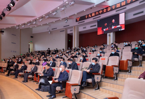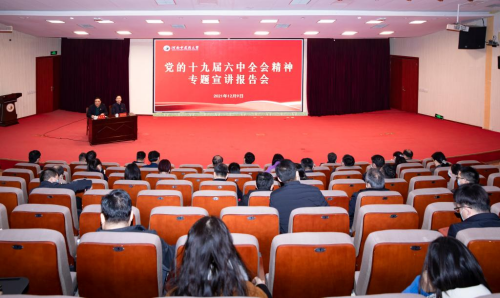 作党的十九届六中全会精神专题宣讲报告。学校全体校领导、中层干部、支部书记、辅导员、民主党派及无党派人士代表等800余人分别在图书馆第一报告厅主会场和25个分会场通过现场聆听和视频直播的方式集中收听收看报告会,报告会由校党委副书记、工会主席张小平主持。