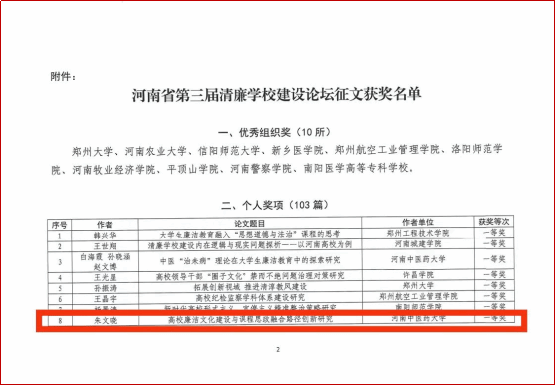 副院长、纪检委员朱文晓撰写的论文《高校廉洁文化建设与课程思政融合路径创新研究》荣获一等奖,并受邀在“河南省第三届清廉学校建设论坛暨高校廉政研究机构负责人联席会议”上就论文研究成果作交流发言。