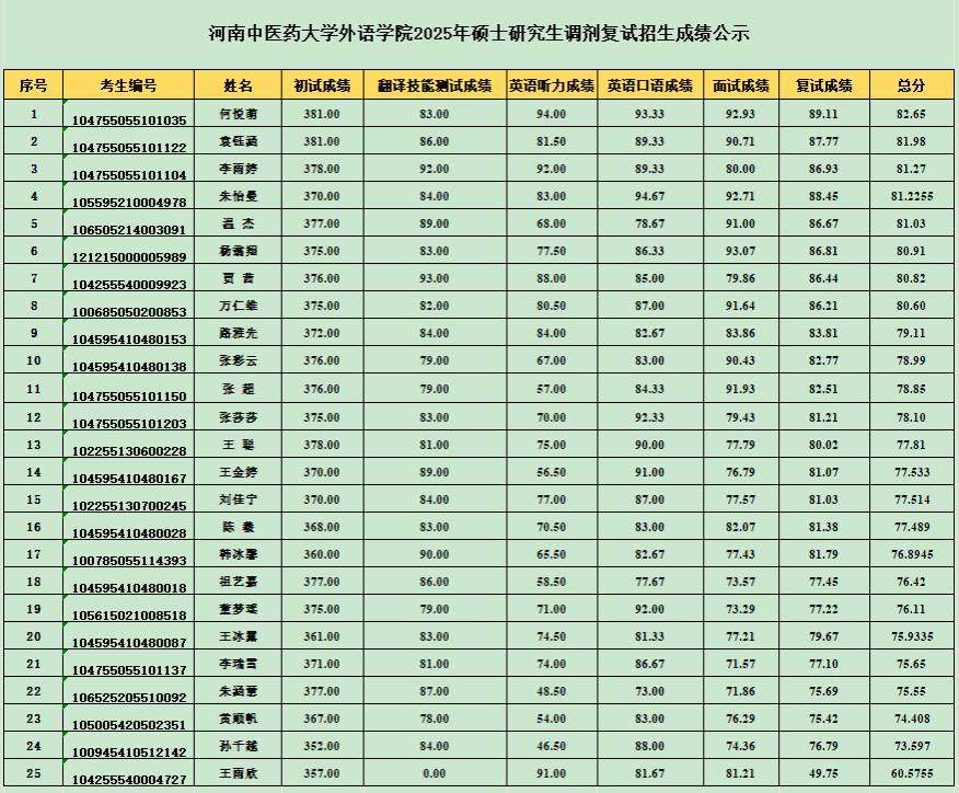 根据教育部《2025年全国硕士研究生招生工作管理规定》(教学〔2024〕4号)、《关于进一步规范全国硕士研究生招生调剂工作的通知》(教学司〔2025〕5号)要求,龙腾小说 在2025年4月12日组织完成2025年龙腾小说 翻译硕士研究生调剂复试。经过评阅审核,现将调剂复试成绩公示如下: