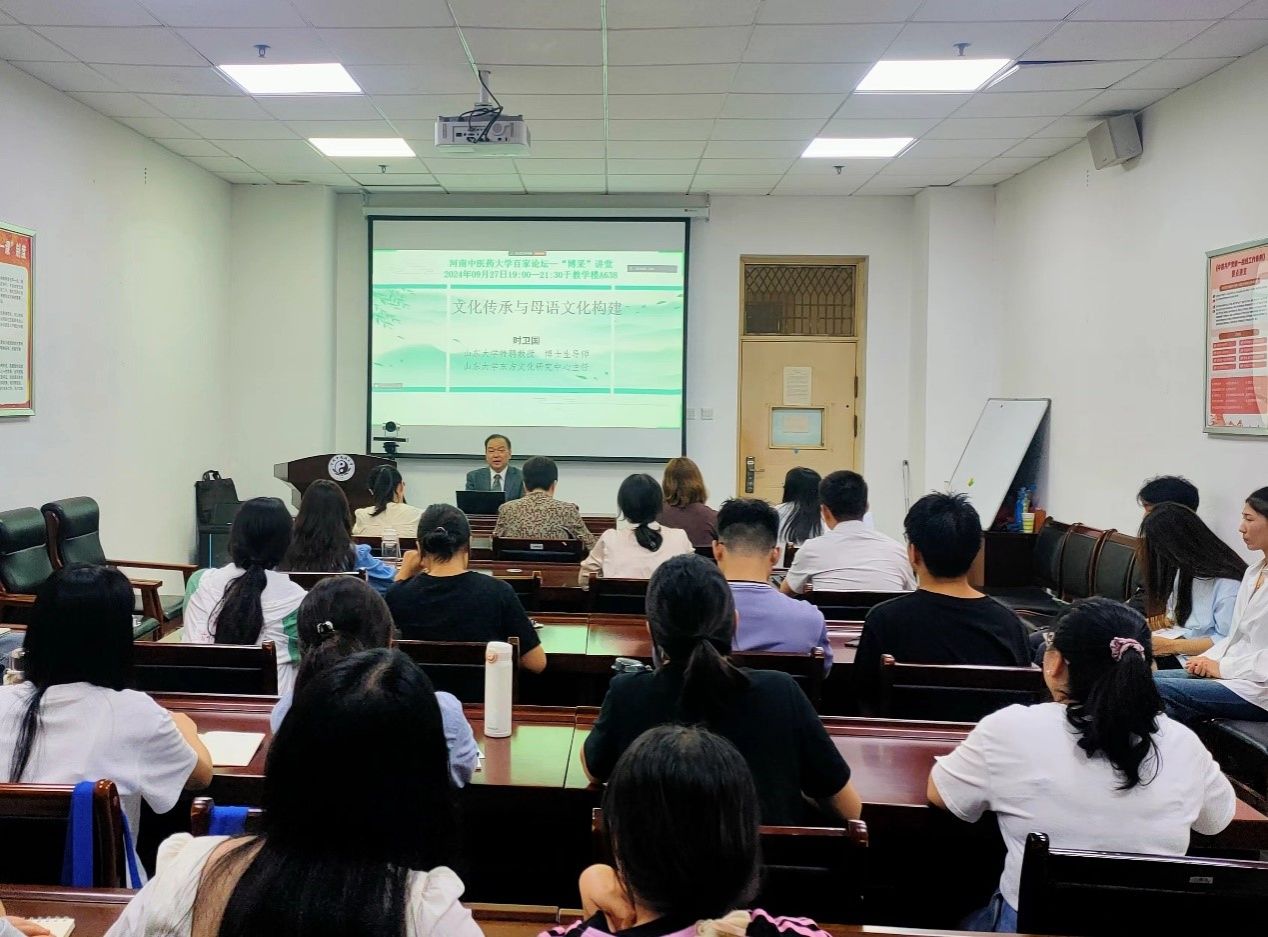 时卫国教授详细介绍了中国传统文化研究的地域分布特色、文化名家的群体特征及代表性研究成果,强调了在加快构建中国话语和中国叙事体系背景下,传统文化传承与母语文化构建的重要性,勉励同学们要积极建构专业知识体系,提升人文素养和文化自信,将传统文化与母语文化嫁接合成,实现内生性发展和趣味性探索,让自己站得更高、走得更远。