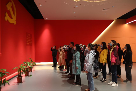 在解说员的带领下,大家参观了“百年恰是风华正茂”党史党性主题教育展,展厅由经典论述、理想信念、永葆初心、时代先锋和出彩中原五个部分组成。500余件珍贵档案文献,将红色资源与党史党性教育有机结合,展现了中国共产党人为革命事业奋斗不息、无私奉献的高尚情怀和中国共产党峥嵘百年的奋斗历程。参观过程中,大家仔细观看展出的历史照片以及文献史料,沿着革命先辈踏过的足迹,感受着前辈的力量,聆听了革命先烈们在历史风雨中为追求真理的可歌可泣事迹,了解了中国共产党领导下河南人民取得革命、建设、改革、发展的辉煌成就。参观结束后,学院师生党员在誓言厅鲜红的党旗下重温入党誓词。