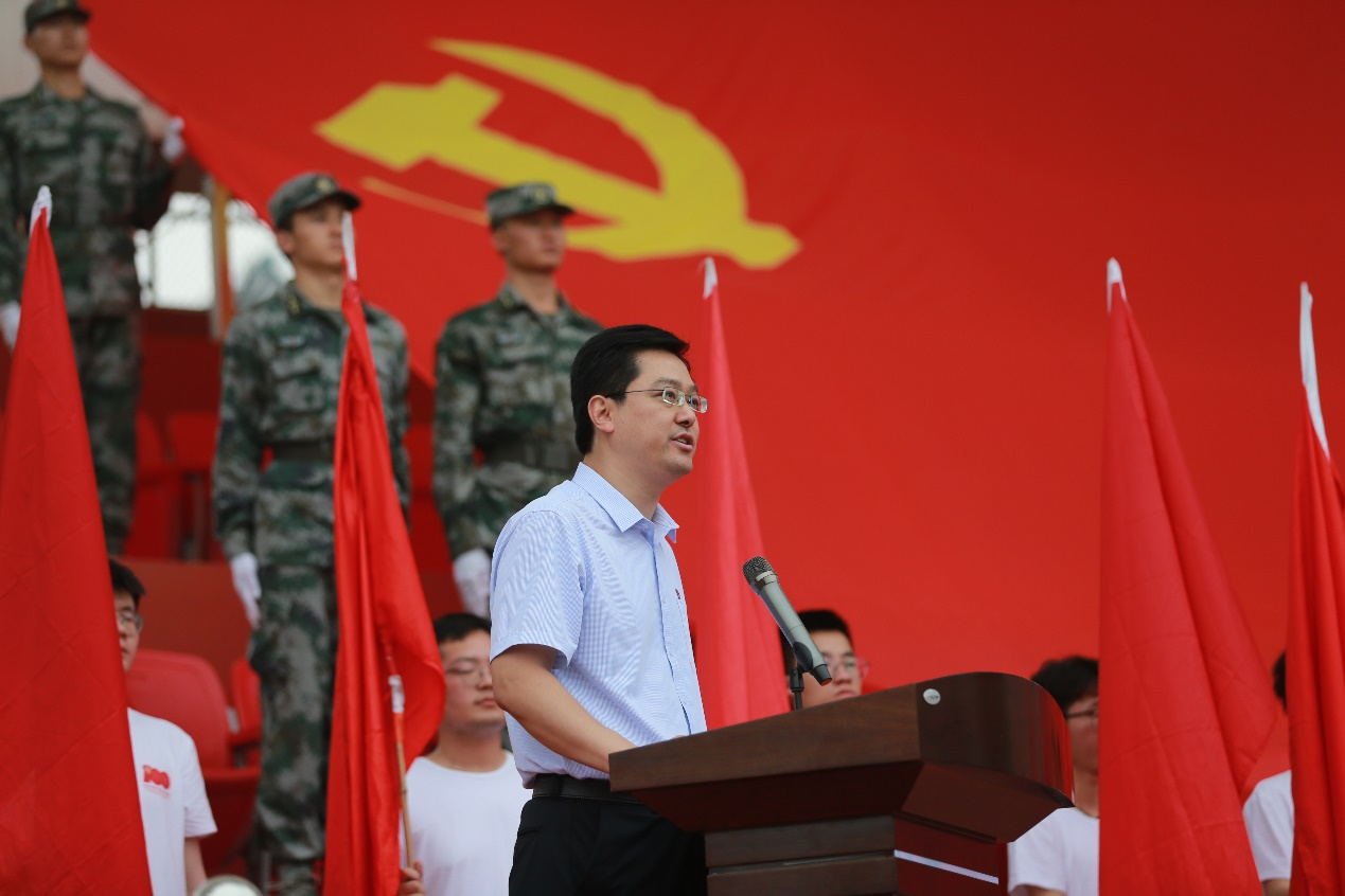 在现场师生们的注视下,英姿飒爽的仪仗队高举党旗,迈着铿锵有力的正步进入会场。庞亚宾作为领誓人带领全体师生党员在党旗前重温入党誓词。誓言回荡在空中,誓词铭刻在心里。