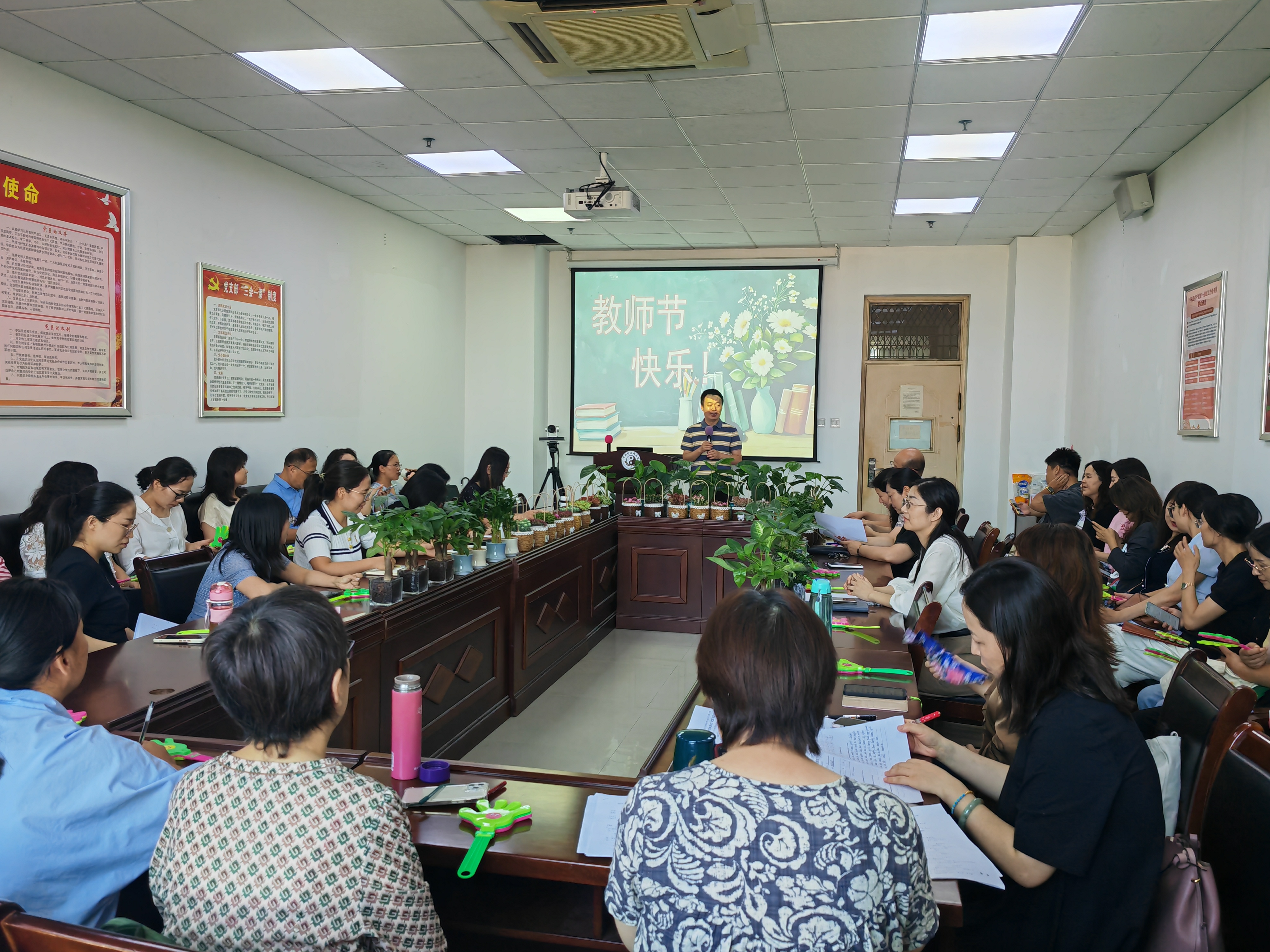 为庆祝第41个教师节,龙腾小说 于9月16日下午在A638组织“浓情谢师恩,绿意寄希冀”教师节主题庆祝活动,学院全体教职工齐聚一堂,共庆属于教育工作者的专属节日。
