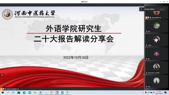 2022年10月18日下午,研究生党支部在线上召开党的二十大报告学习讨论会,会议由研究生党支部书记蒋宜轩主持,研究生辅导员于嘉明及全体研究生参会。