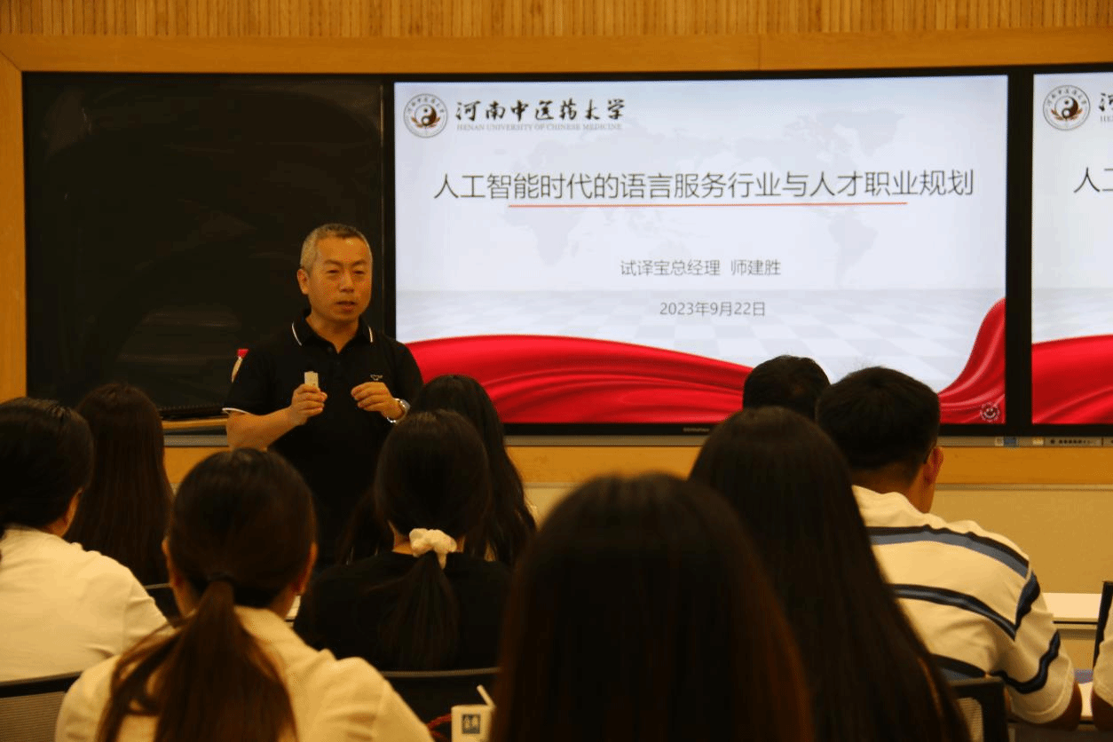 师建胜首先向大家介绍了国内外语言服务行业发展前沿趋势和语言服务对人才的最新需求,并且针对人工智能背景下的翻译实践与同学们一道进行了探讨。随后,他详细分析了企业对人才的需求,提出了职业生涯管理模型,重点从翻译专业学生如何进行职业规划,翻译专业的职业前景和成长路径等方面解答了同学们许多未来语言服务行业就业的困惑。